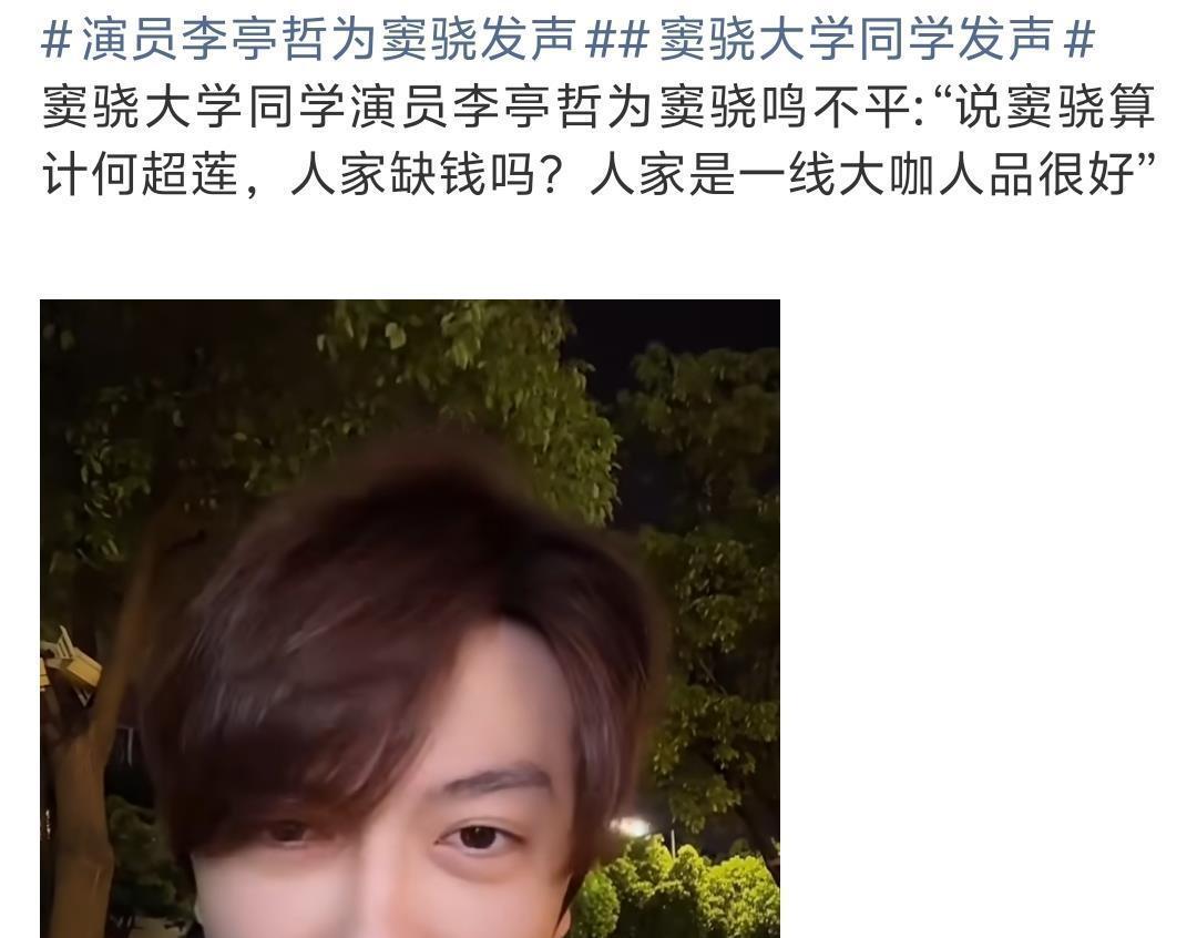 不过,窦骁大学同学演员李亭哲为窦骁鸣不平:“说窦骁算计何超莲,人家缺钱吗?人家是一线大咖人品很好”不过,李亭哲的一番话,引起网友质疑,说窦骁实力不错可以,但一线大咖有点过分了吧。