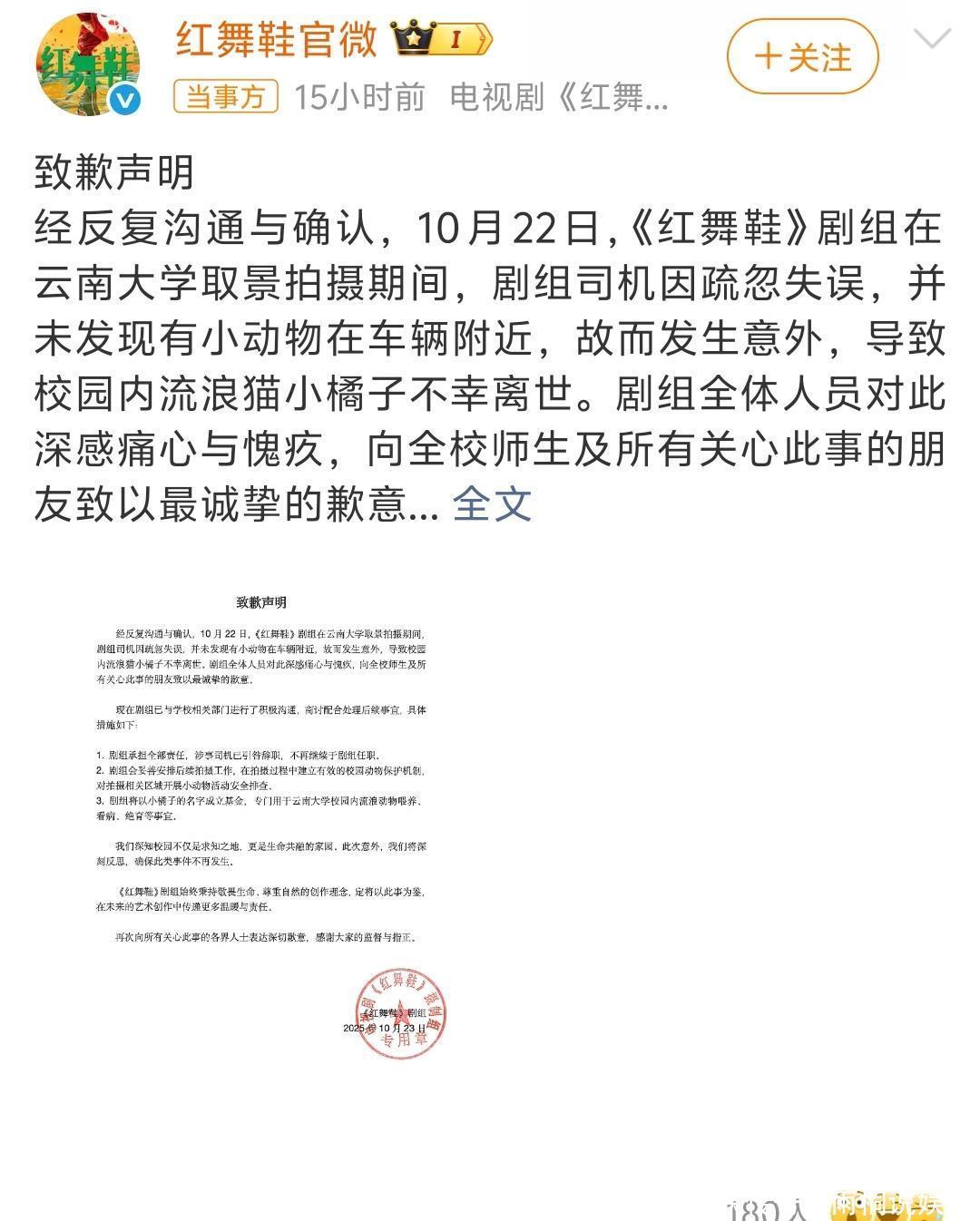 今天的娱乐圈发生了不少事情,有人宣布三胎喜讯,有人替好友辟谣,有人发文回应婚姻情况,甚至于还有剧组发声道歉,的确是个个离谱接下来就让我们一起来看看!1、红舞鞋剧组发文道歉,因司机疏忽撞到小猫,致其离世,引发网友热议昨天晚上,有网友突然曝出大瓜,称红舞鞋剧组,在大学校园里取景拍摄,结果撞上了一只校园中的小猫咪,致其离世事情很快冲上热搜。