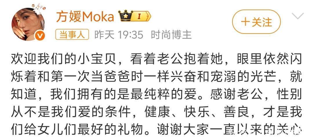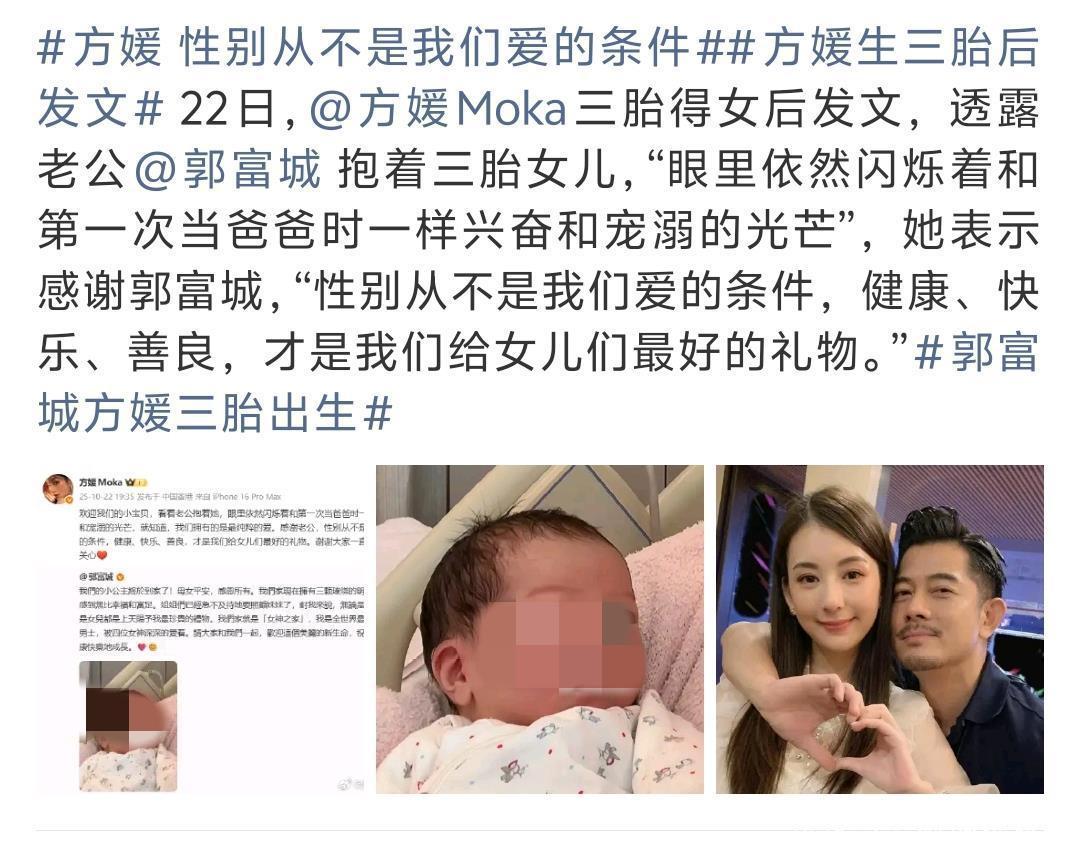 昨天晚上,在得女的第一时间,方媛发文:“眼里依然闪烁着和第一次当爸爸时一样兴奋和宠溺的光芒”,她表示感谢郭富城,“性别从不是我们爱的条件,健康、快乐、善良,才是我们给女儿们最好的礼物。”配图则是自己三胎的女儿。