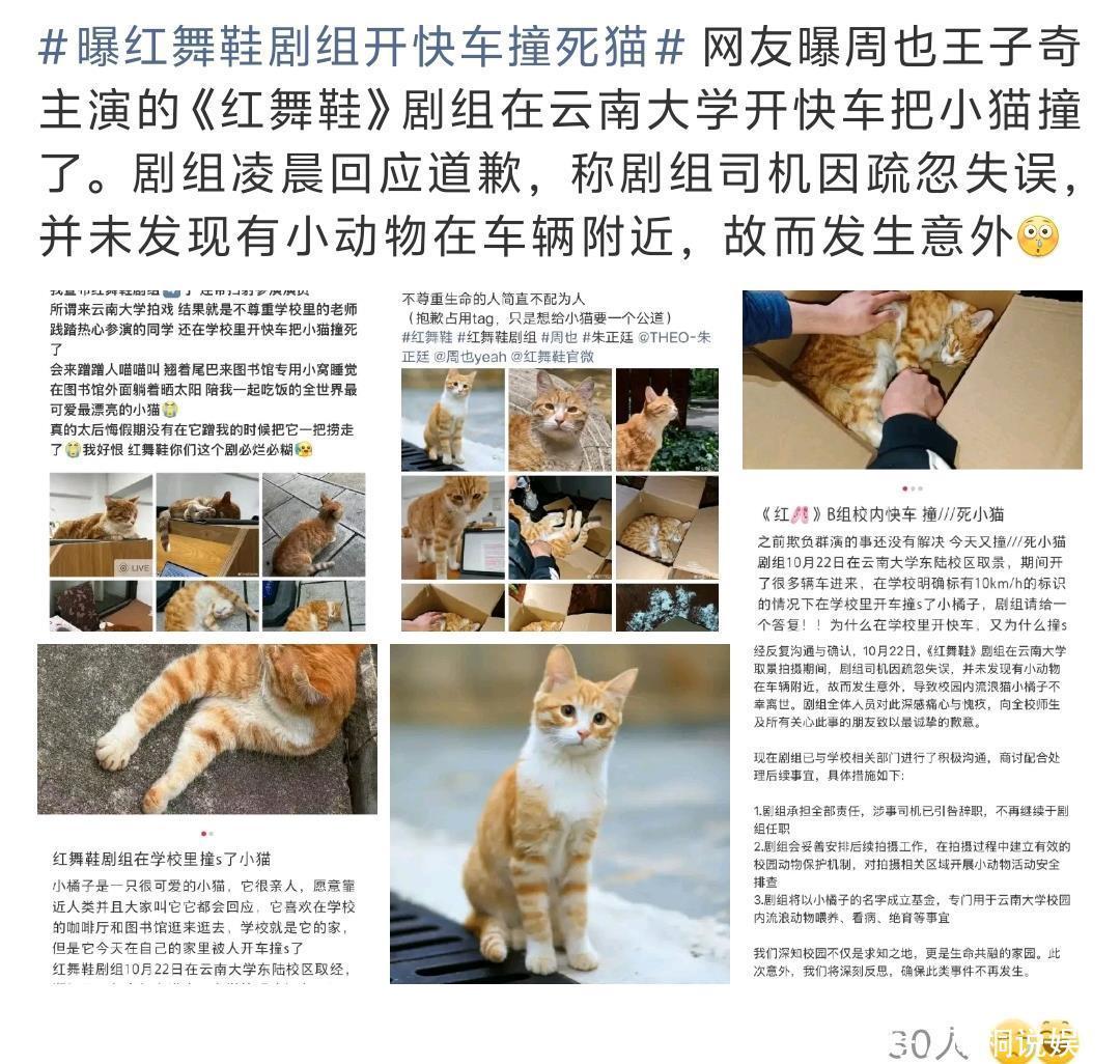 很快红舞鞋剧组迅速做出反应,首先是发文进行道歉,并且表示涉事司机已经被开除离职。而红舞鞋方透露的细节是,在车辆旁边并未发现猫咪的踪迹,这件事情是个意外,同时感到十分悲痛。