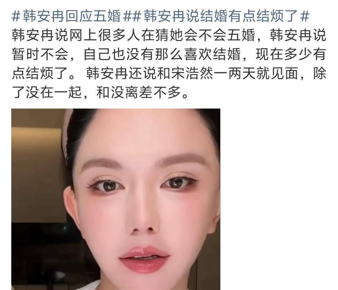 其中,就有一条,有网友提问韩安冉会不会五婚,而韩安冉在直播时就回应了这个问题。她表示:“暂时不会五婚,咱也没有那么喜欢结婚,现在多少有点结烦了”。不过,韩安冉也没有否认以后可能在寻求一段新的感情。而韩安冉还透露,自己和宋浩然“一两天就见面,除了没在一起,和没离差不多”。